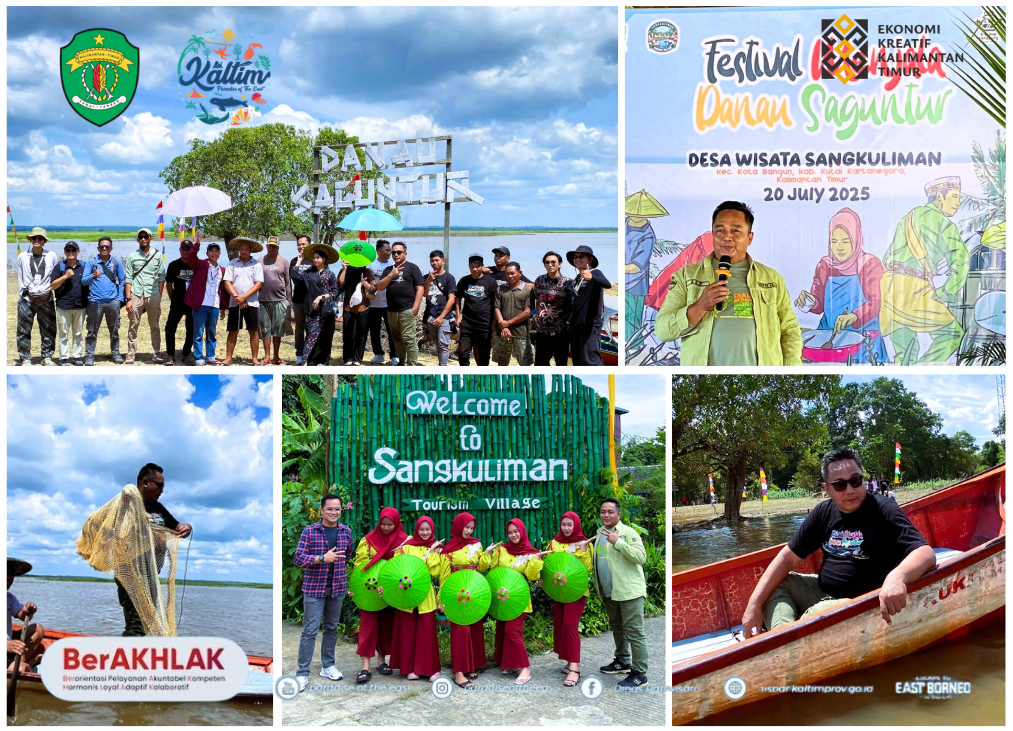Sangkuliman, 20 Juli 2025 – Dalam upaya mendorong pengembangan destinasi wisata berbasis budaya dan pelestarian lingkungan, Dinas Pariwisata Provinsi Kalimantan Timur memberikan dukungan penuh kepada Kelompok Sadar Wisata (Pokdarwis) BMT dalam penyelenggaraan Festival Menjala Danau Saguntur di Desa Sangkuliman, Kecamatan Kota Bangun.