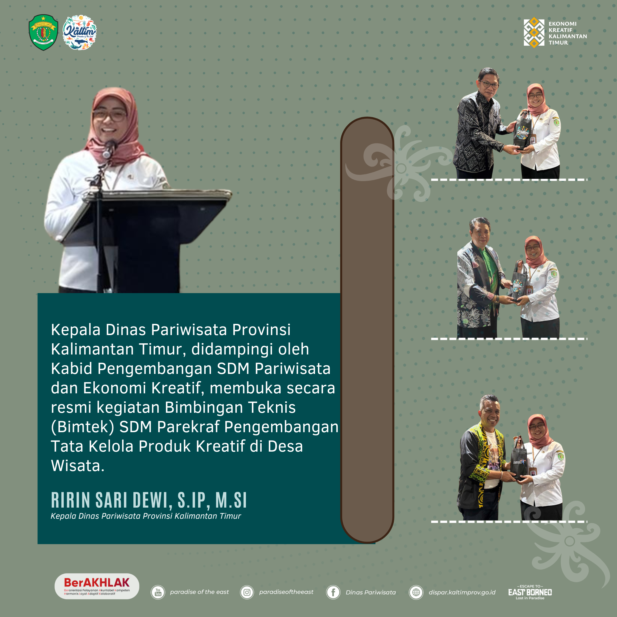 Kepala Dinas Pariwisata menghadiri kegiatan Bimtek Tata Kelola Produk Kreatif. Peserta yang mengikuti kegiatan ini berasal dari 10 Desa Wisata Juara Lomba Desa Wisata Terbaik Kalimantan Timur Tahun 2025, dengan jumlah 30 (tiga puluh) orang yang terdiri dari unsur Pokdarwis, pelaku Ekonomi Kreatif, serta aparatur desa dari 10 kabupaten/kota se-Kalimantan Timur.